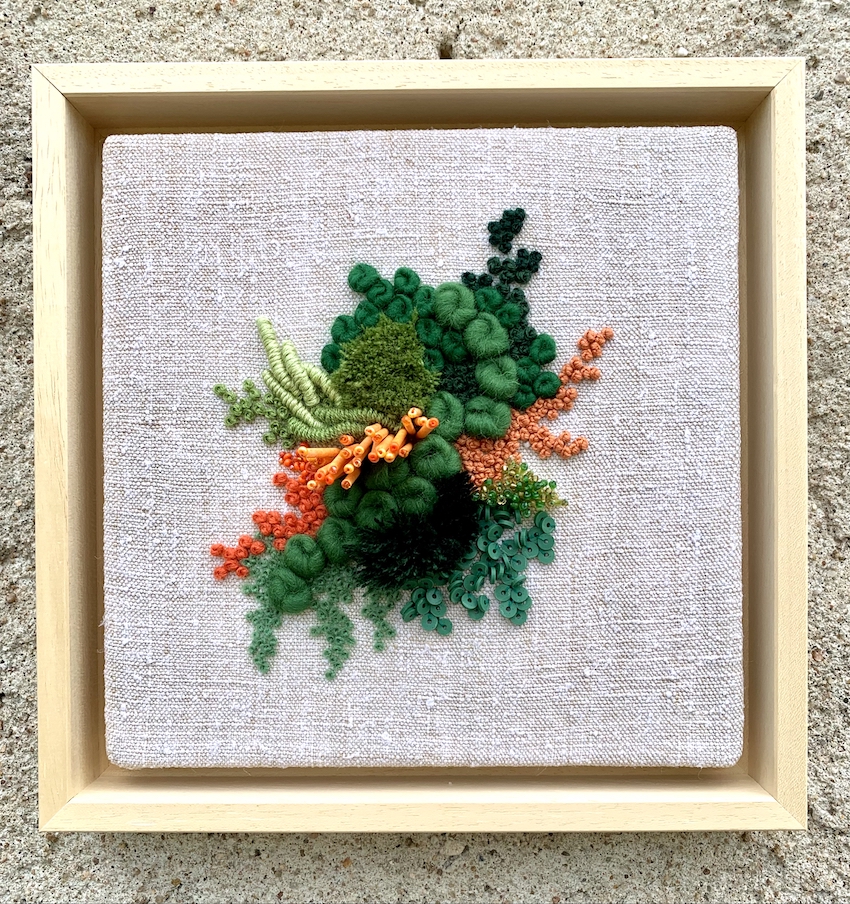 Fils de laine et coton brodés à la main avec perlage et feutrage, sur base de coton, dans un cadre en bois