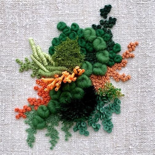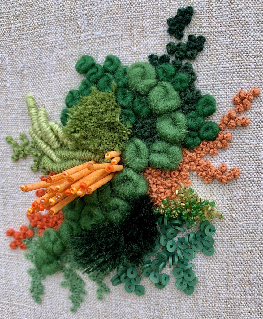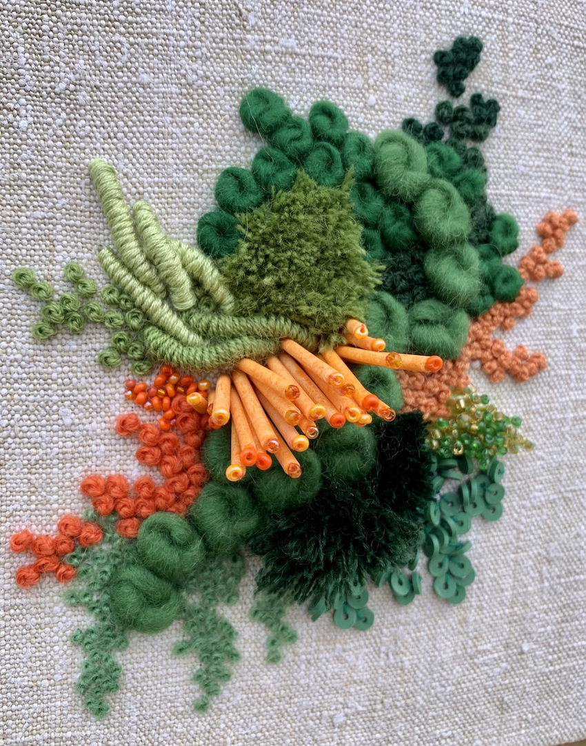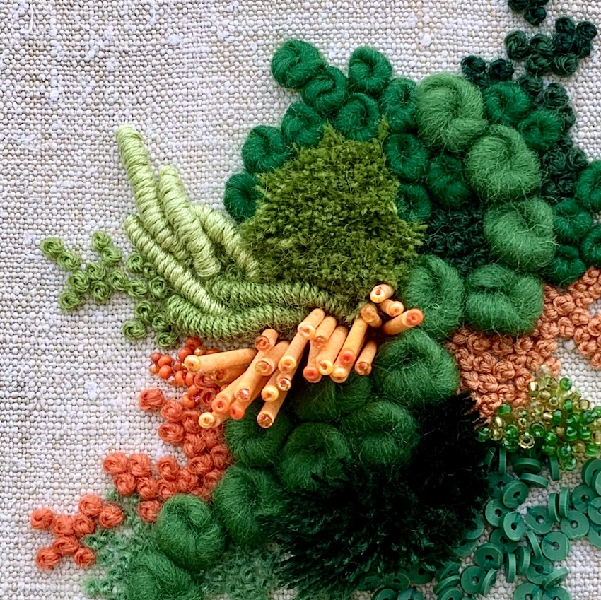 Hand embroidered wool and cotton threads with beading and felting, on cotton base, in a wooden frame