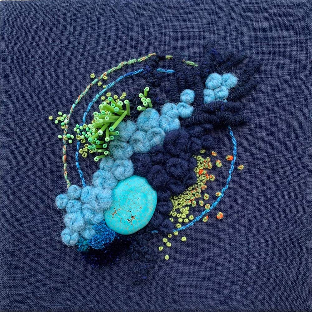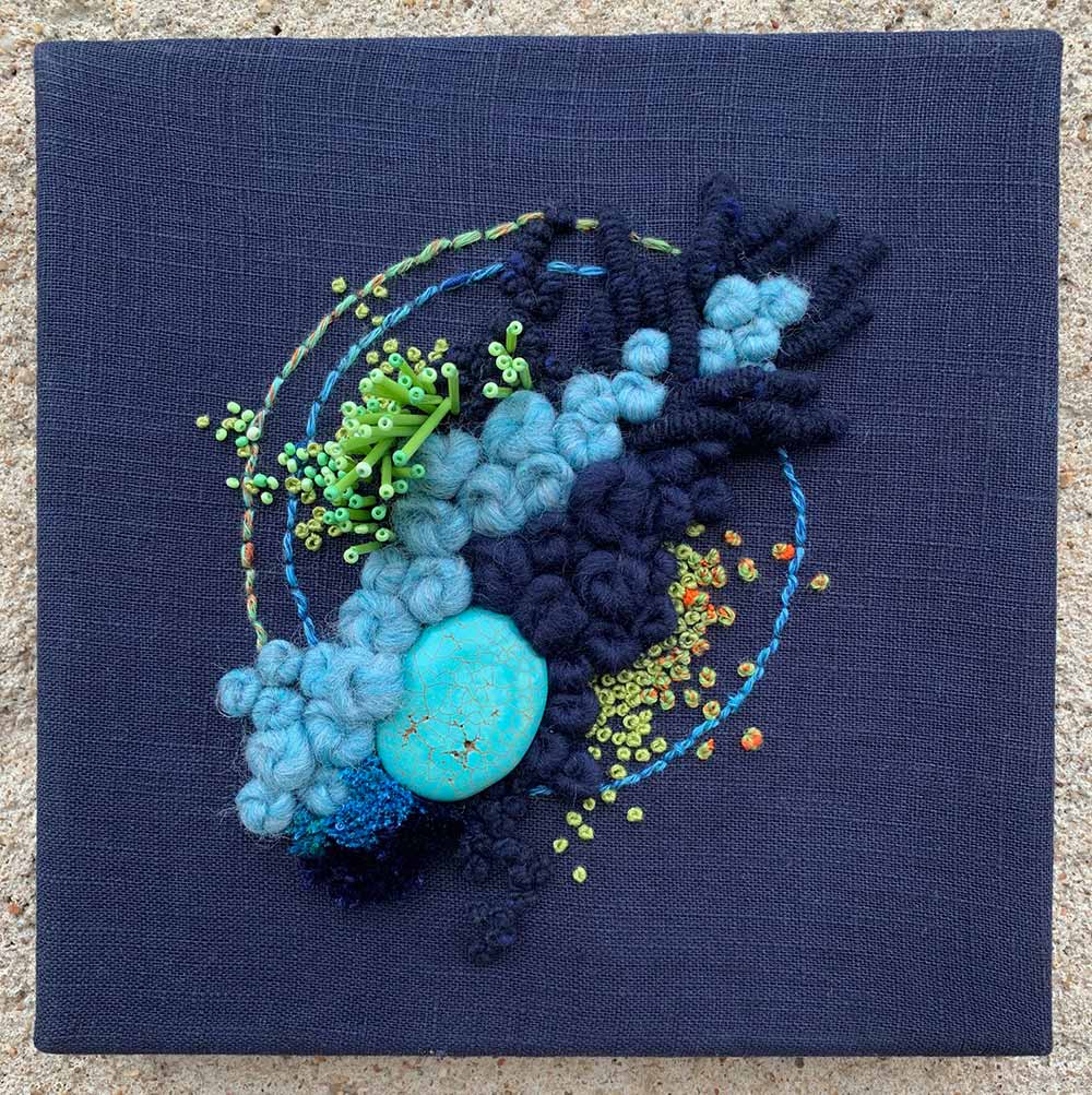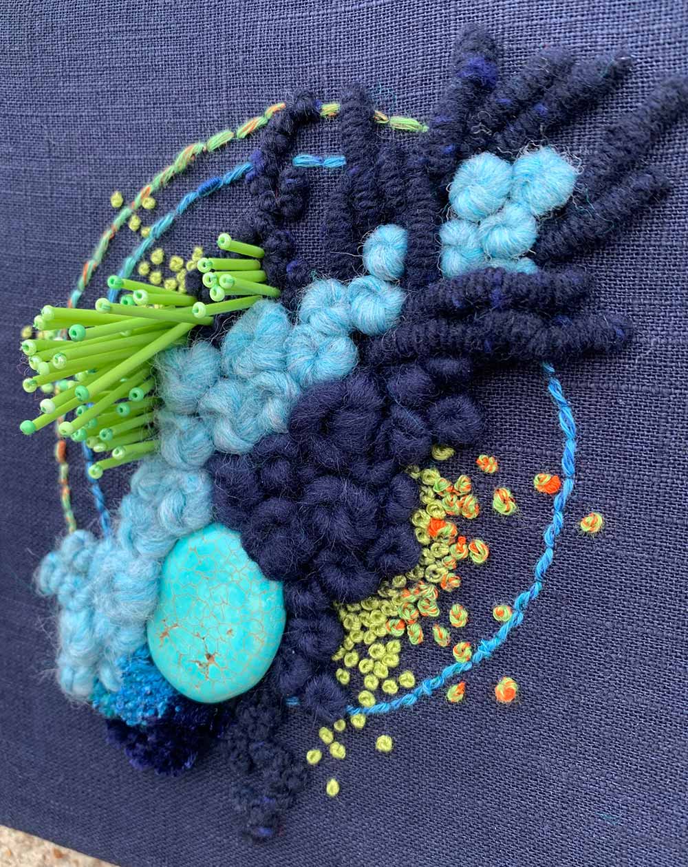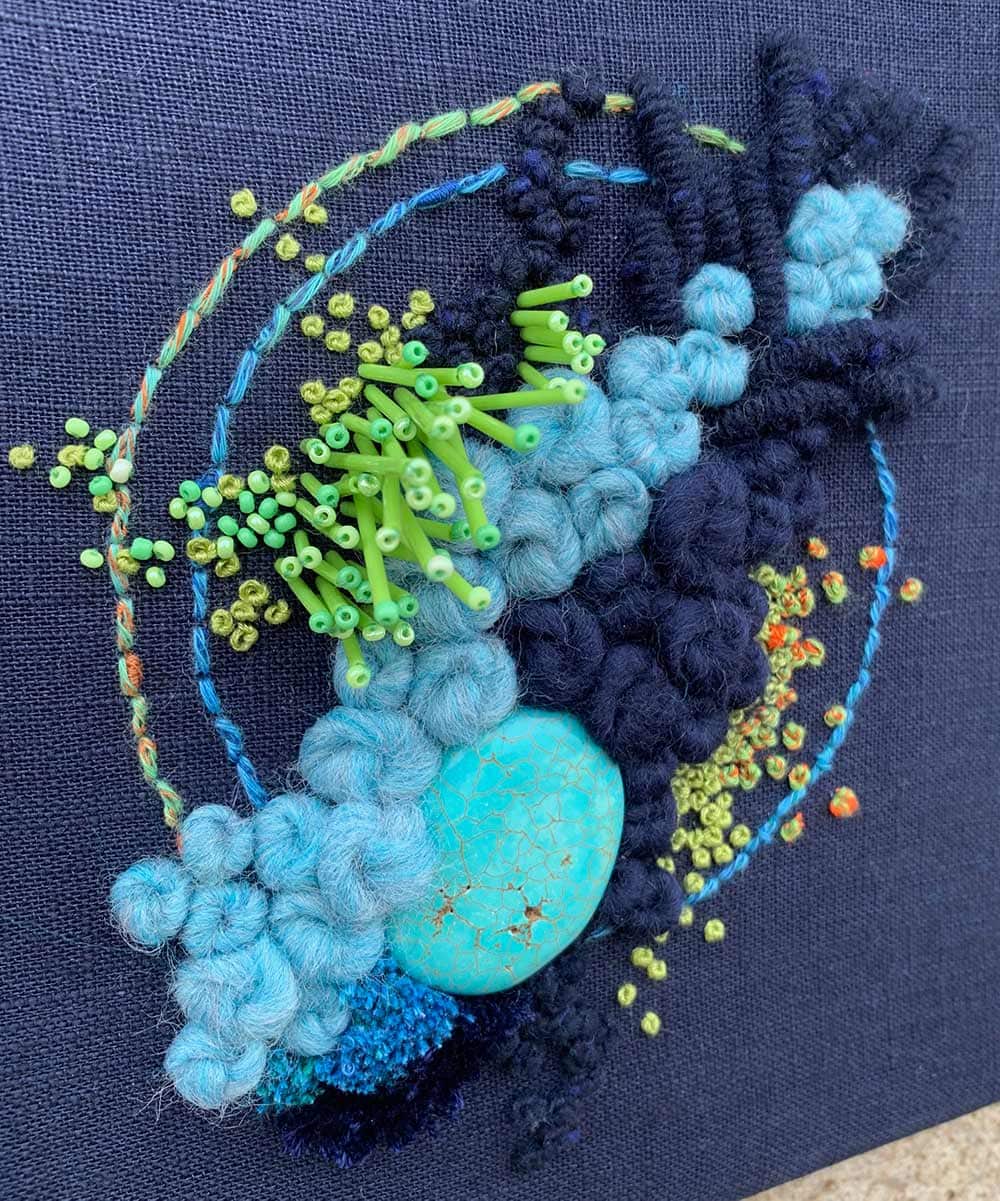 Fils de laine et coton brodés à la main avec perlage, sur base de coton
