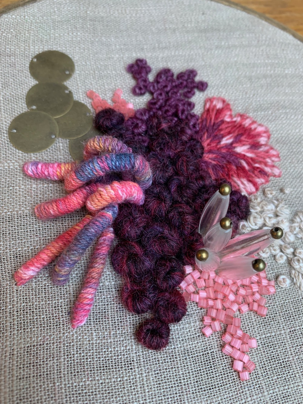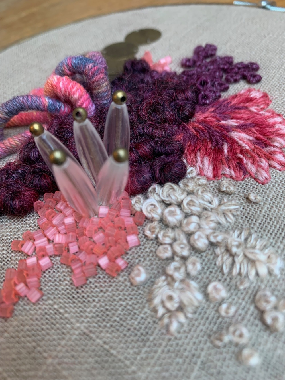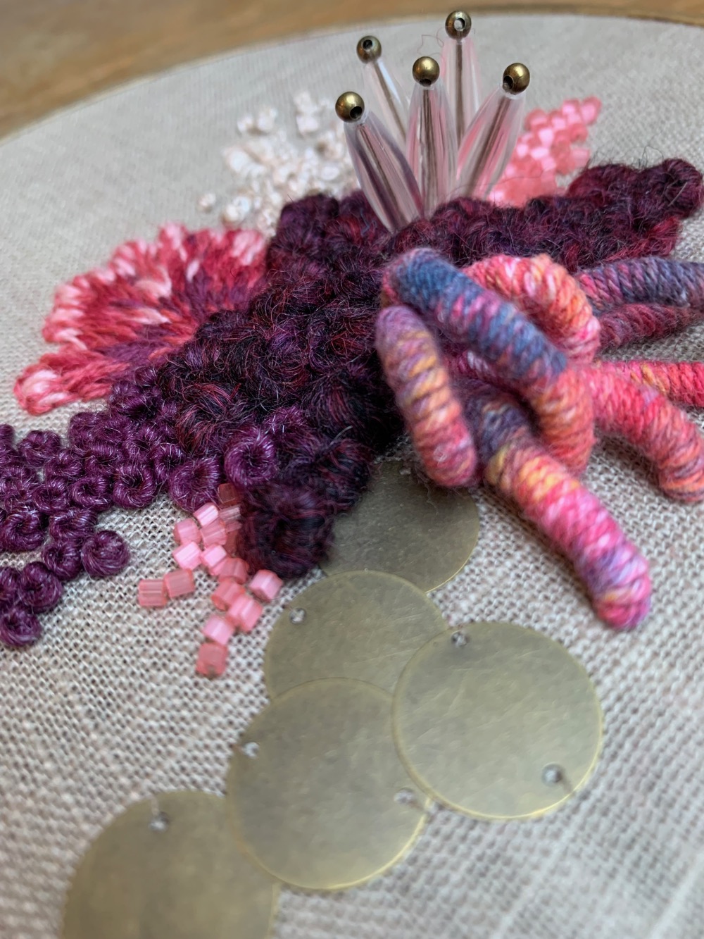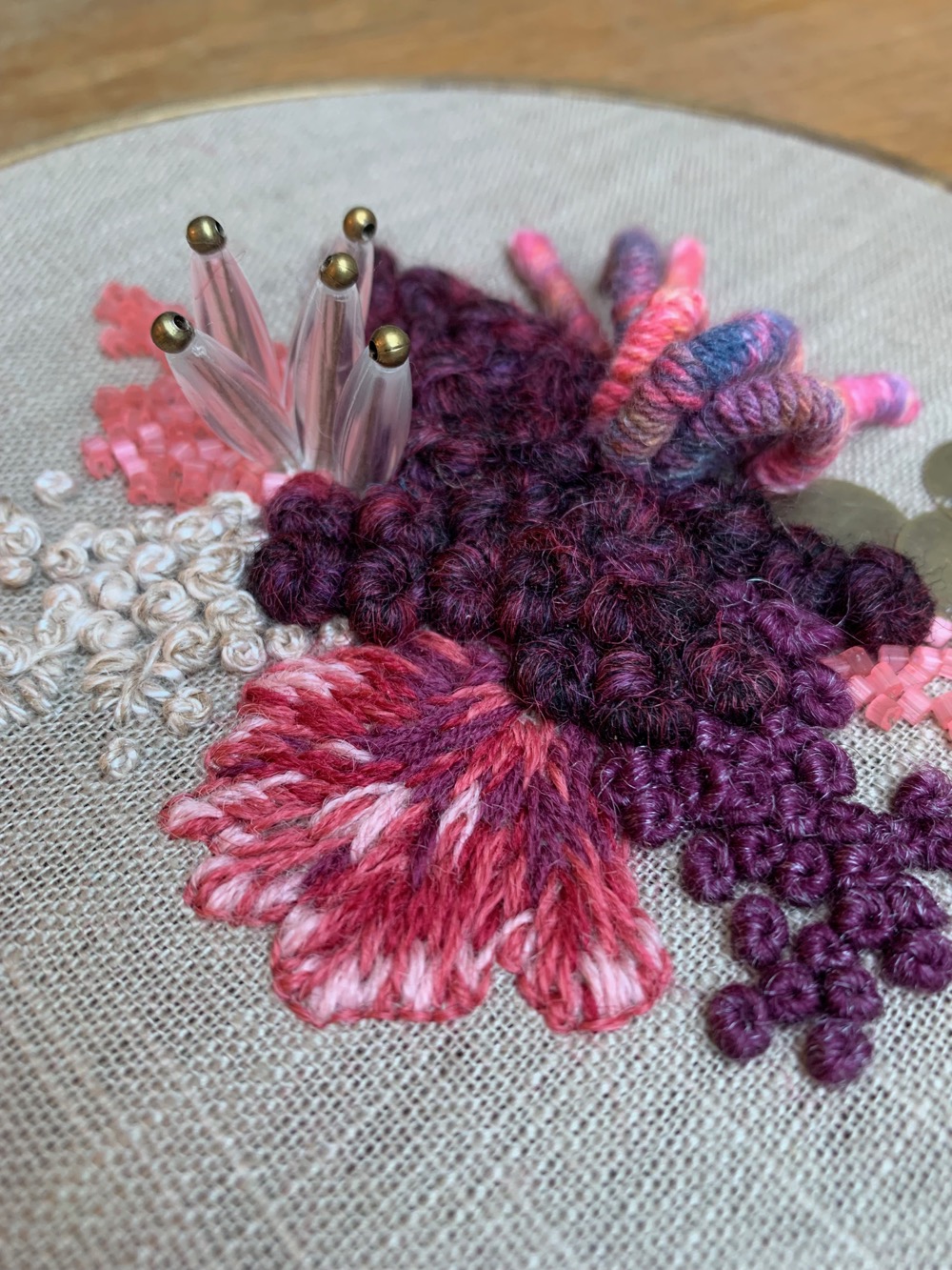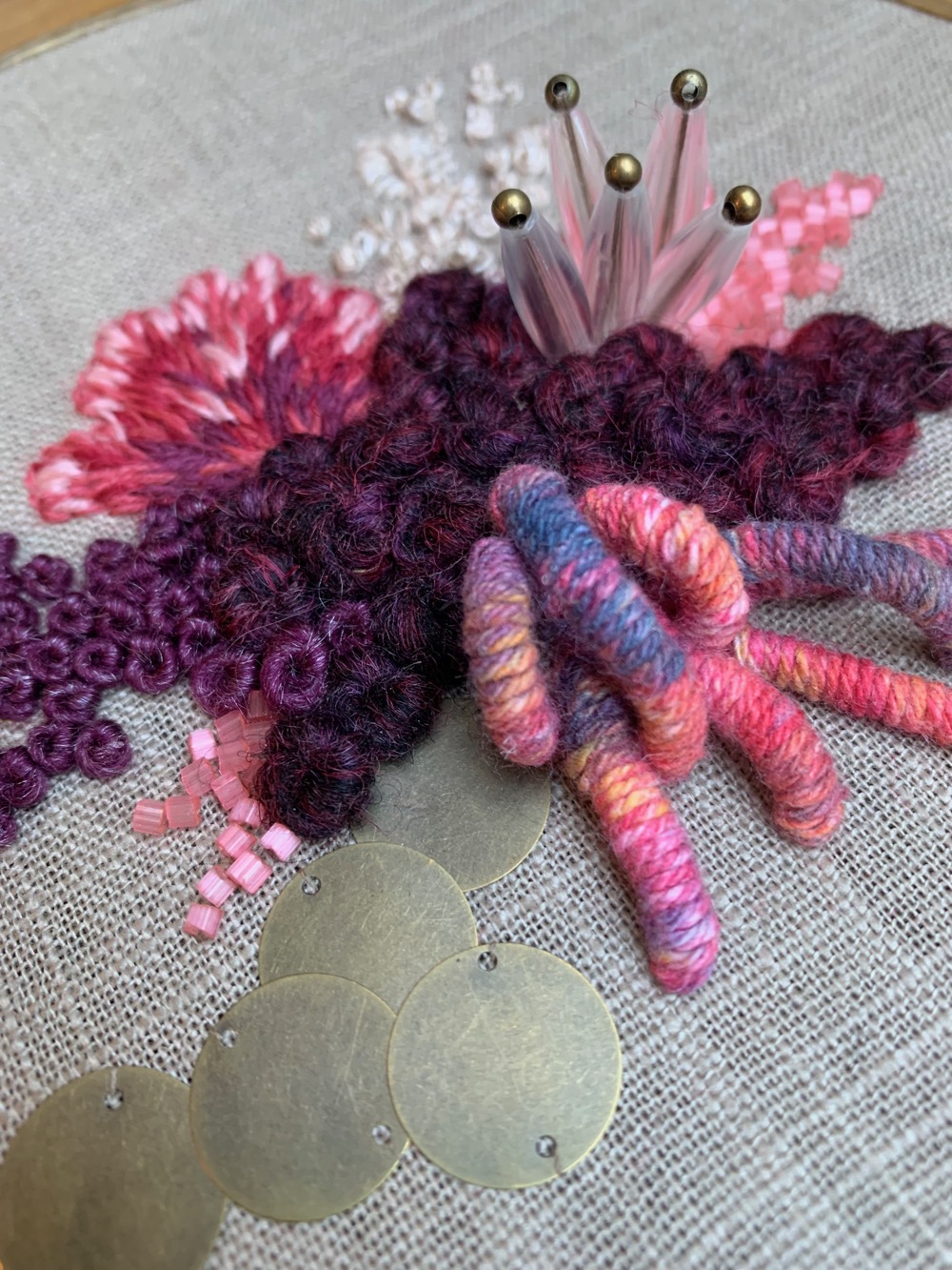 Hand embroidered wool and cotton threads with beading and felting, on cotton base