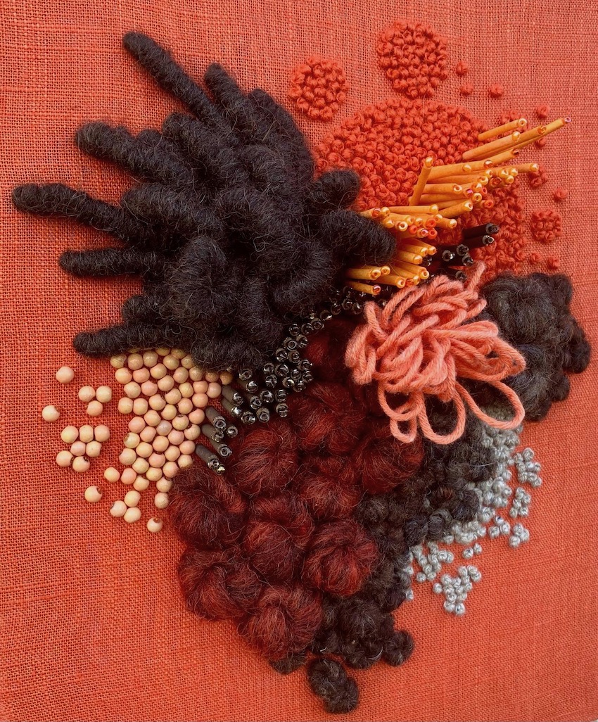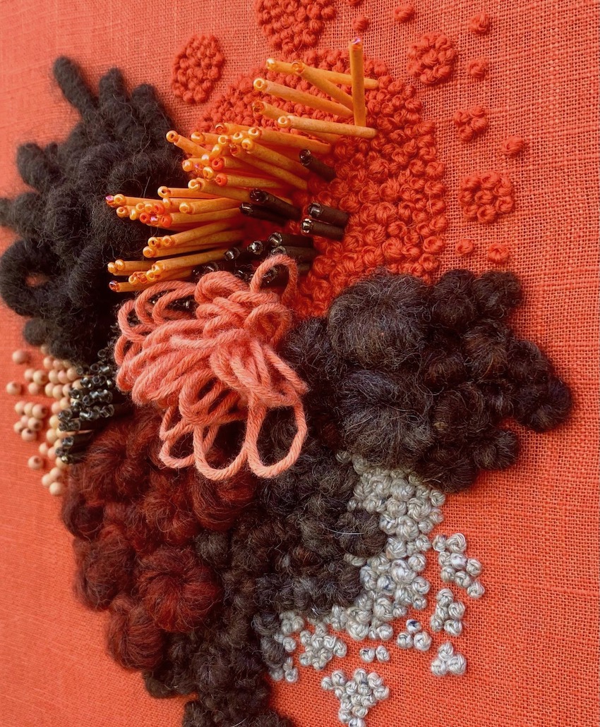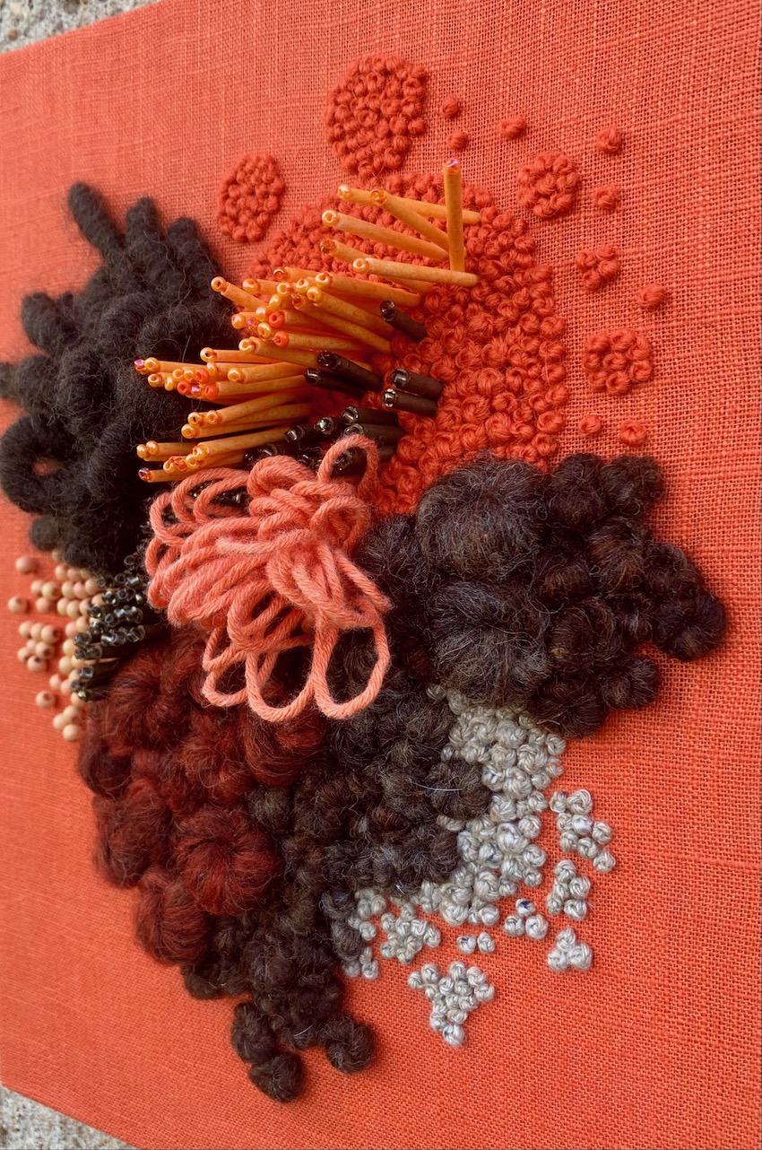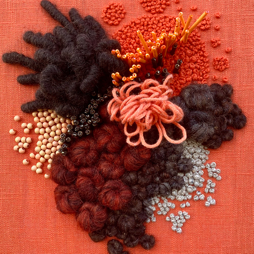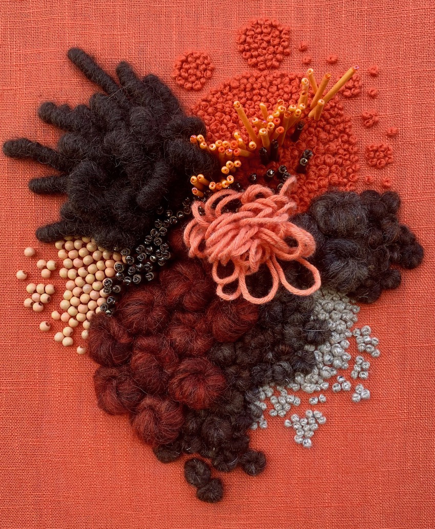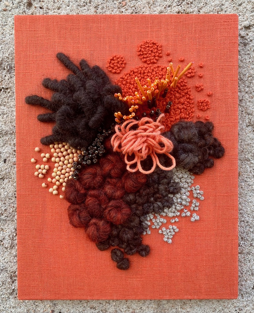 Hand embroidered wool and cotton threads with beading, on cotton base