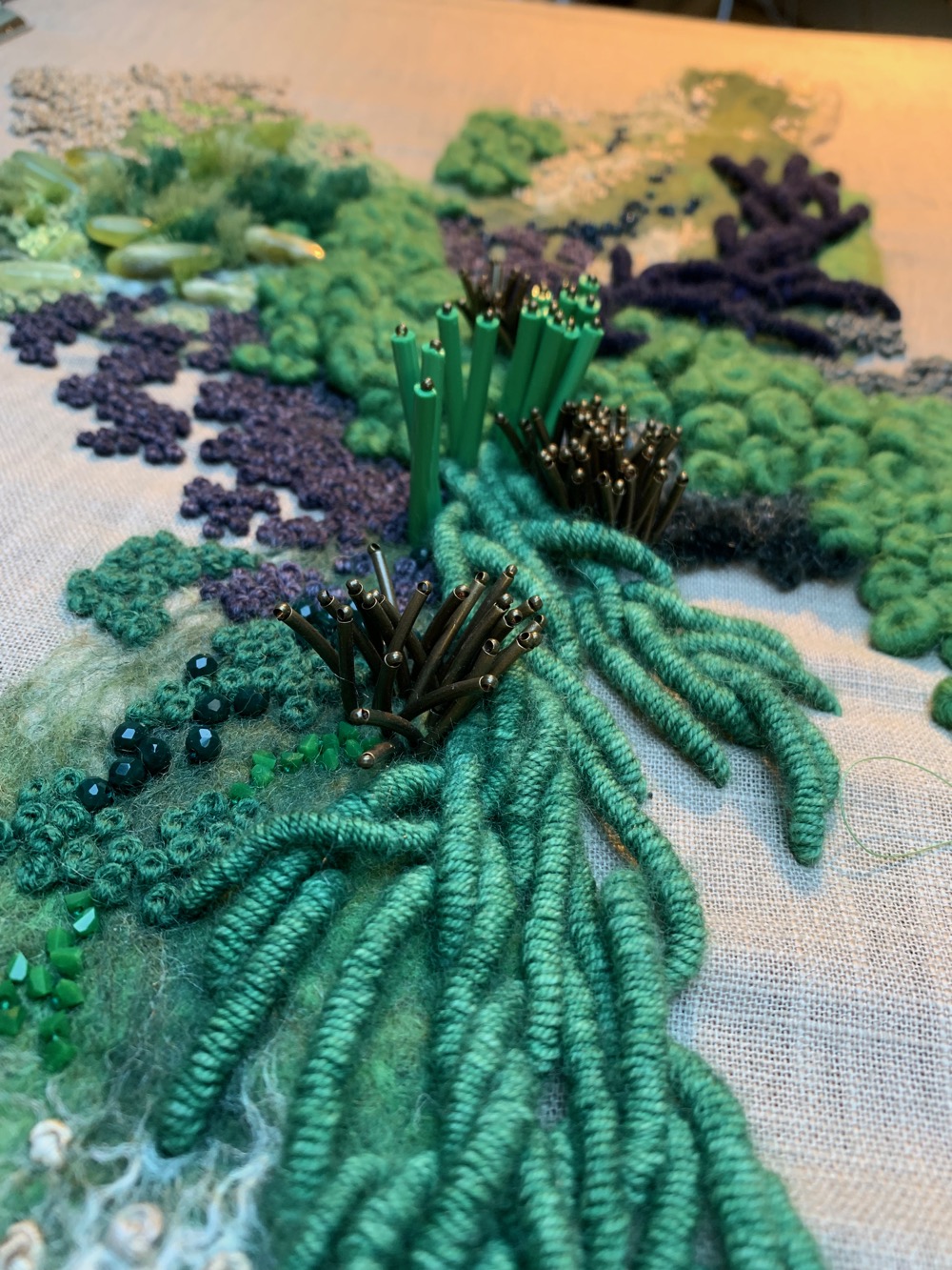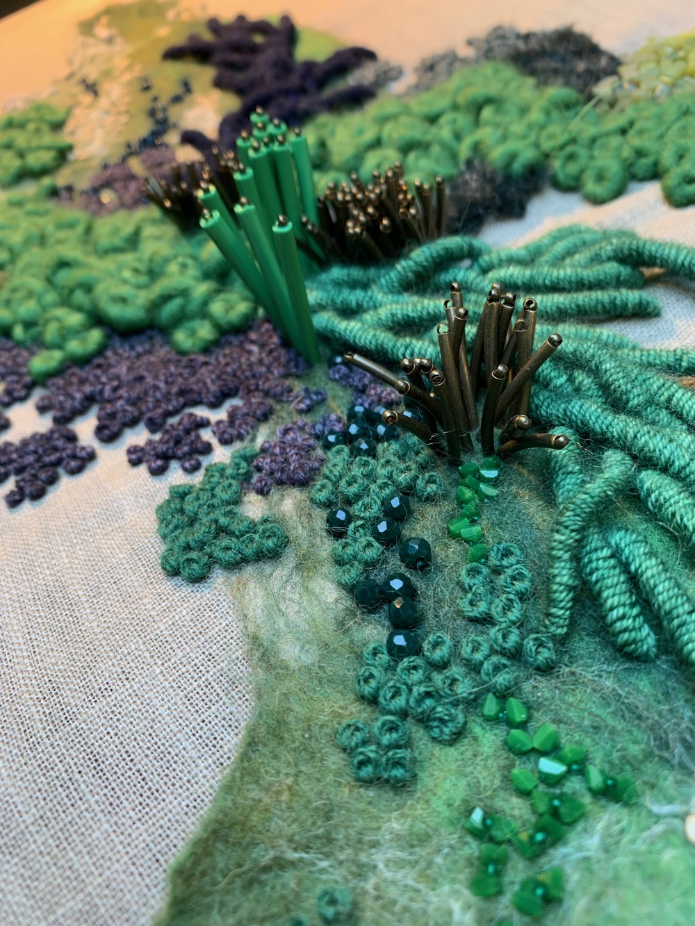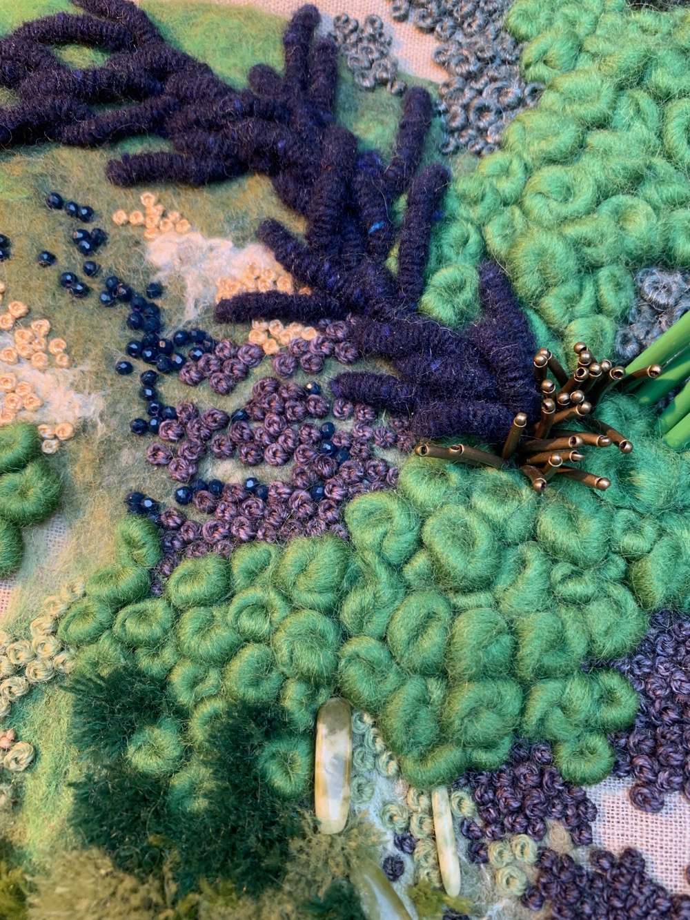 Hand embroidered wool and cotton threads with beading and felting, on cotton base