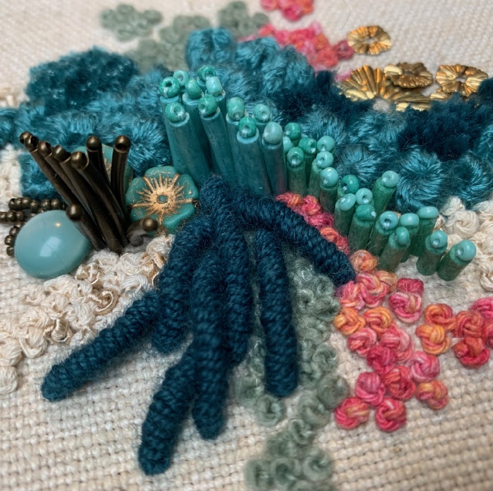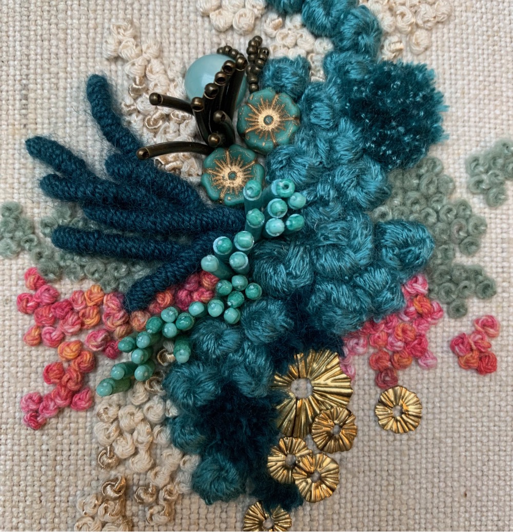 Hand embroidered wool and cotton threads with beading and felting, on cotton base