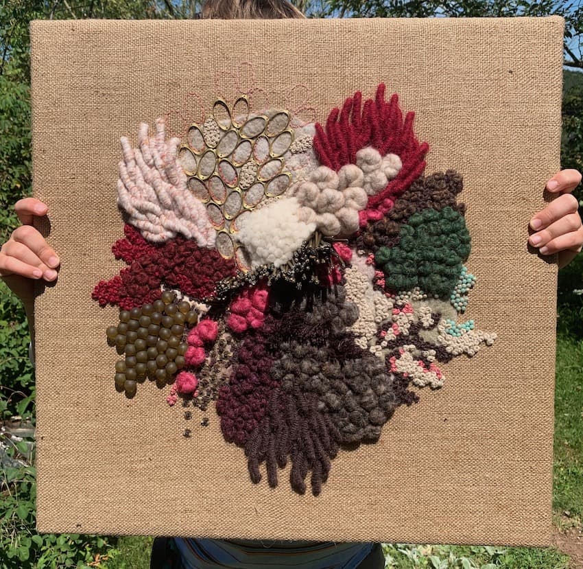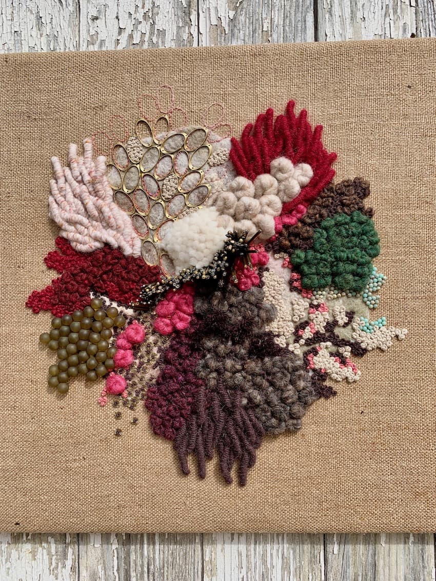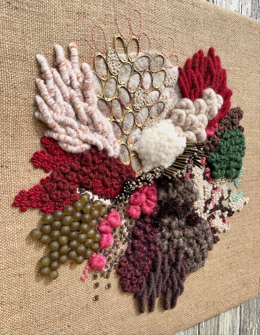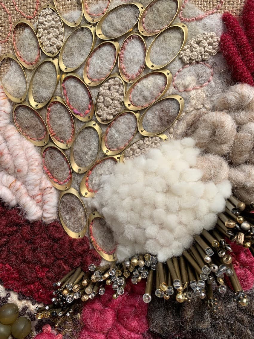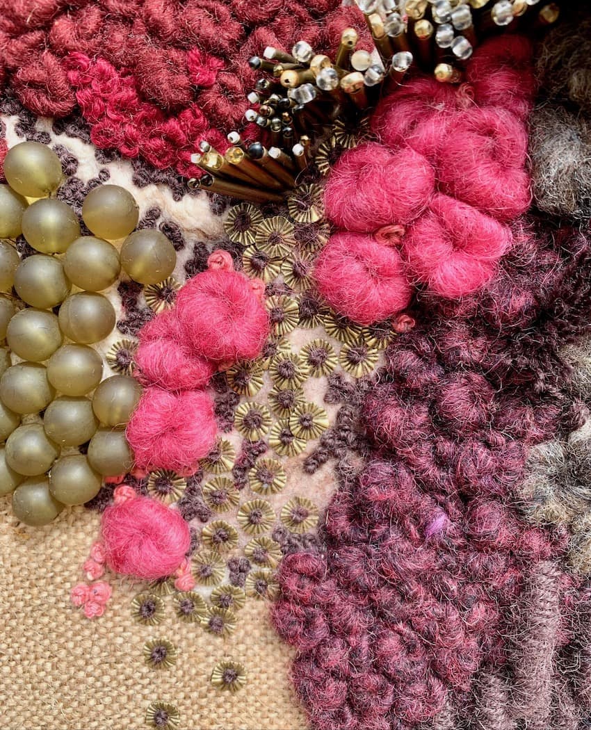 Fils de laine et coton brodés à la main avec perlage et feutrage, sur base de toile de jute