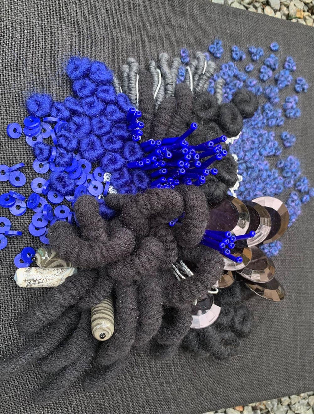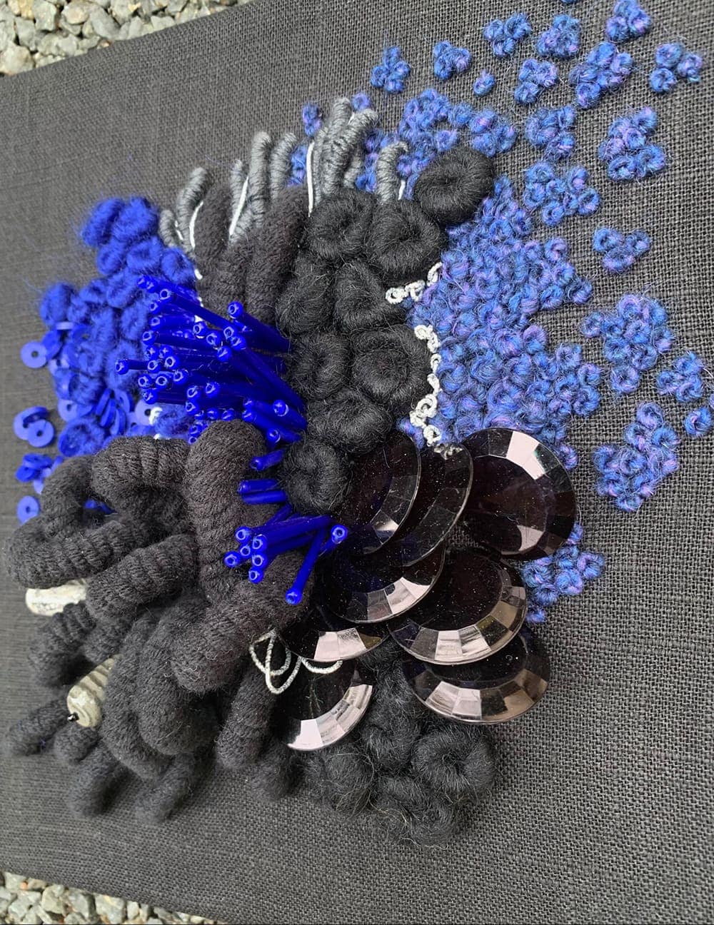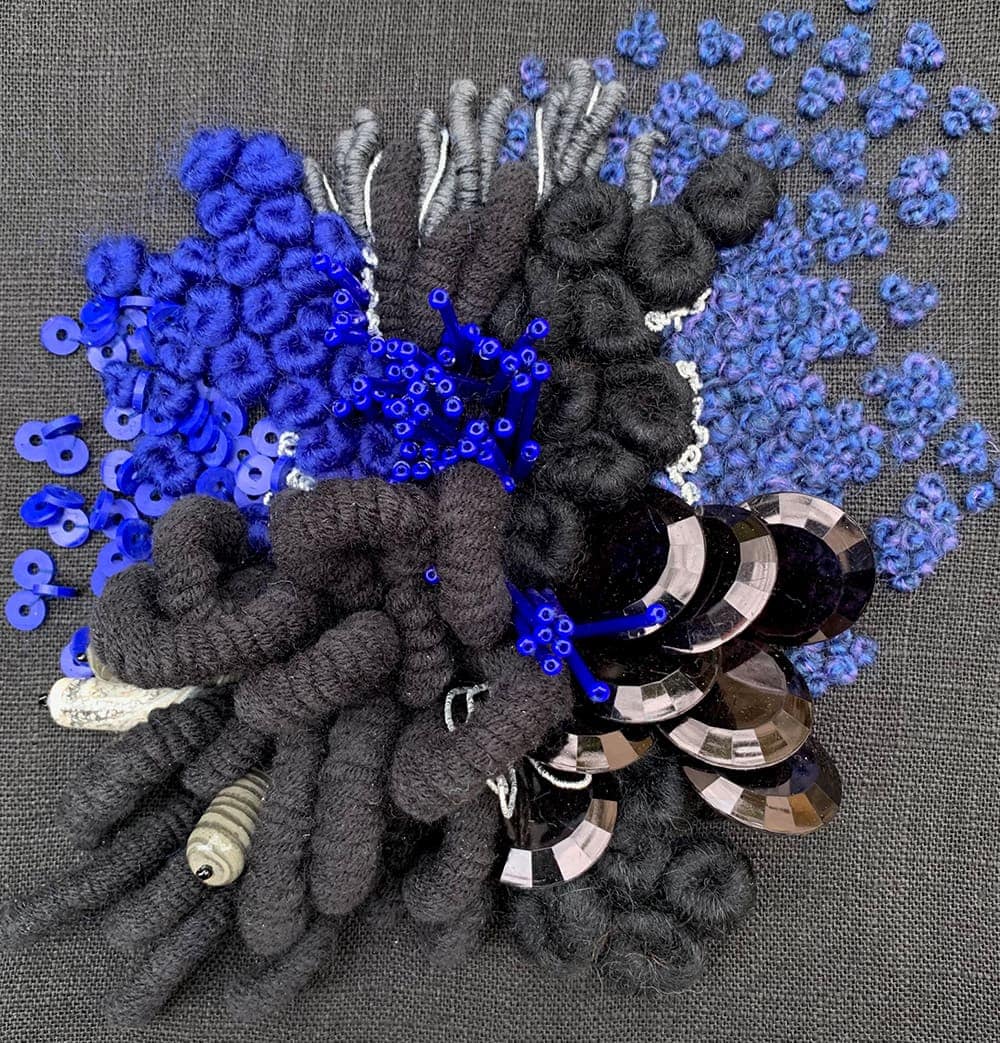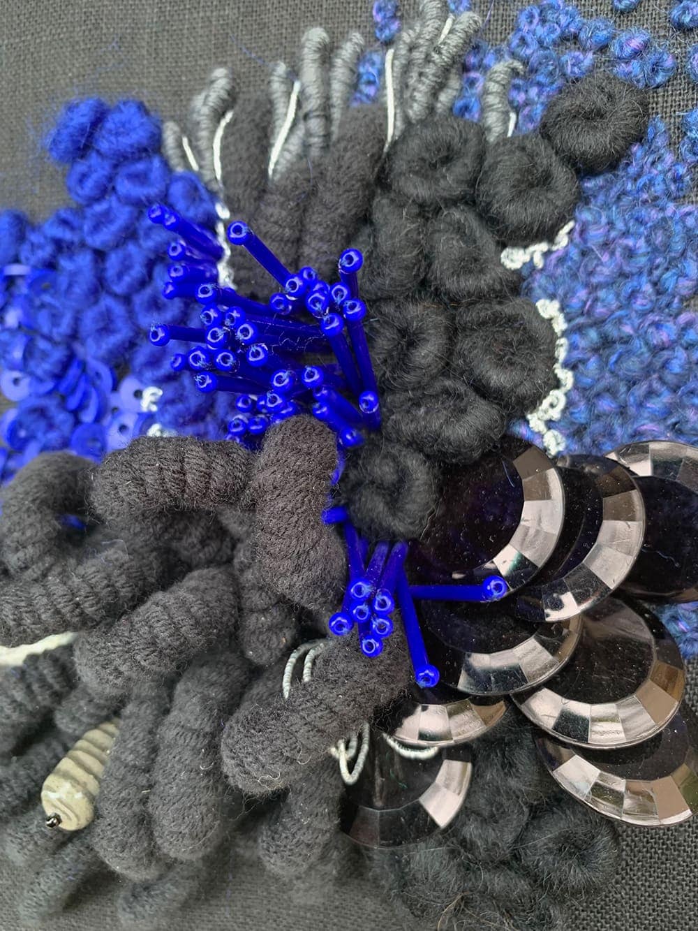 Fils de laine et coton brodés à la main avec perlage, sur base de coton