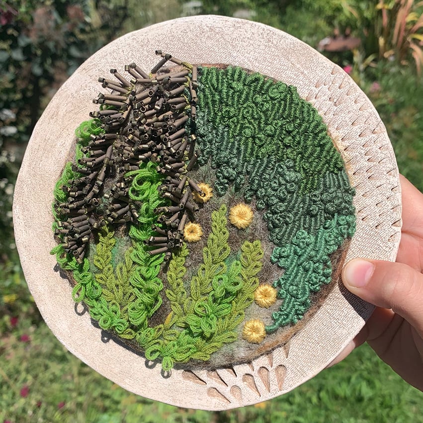 Fils de laine et coton brodés à la main avec perlage, sur base de feutre et ceramique