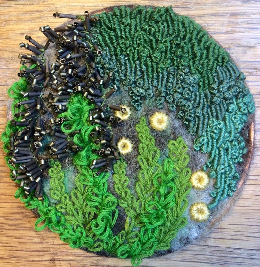 Hand embroidered wool and cotton threads with beading, on felt base with ceramique mount