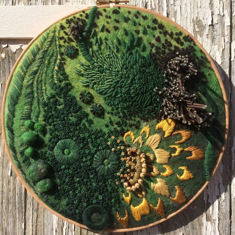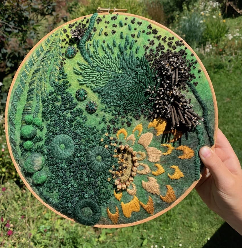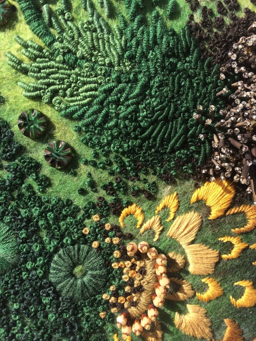 Fils de laine et coton brodés à la main avec perlage et feutrage, dans cerceau en bois, sur base de feutre