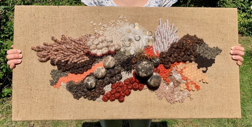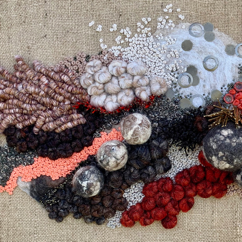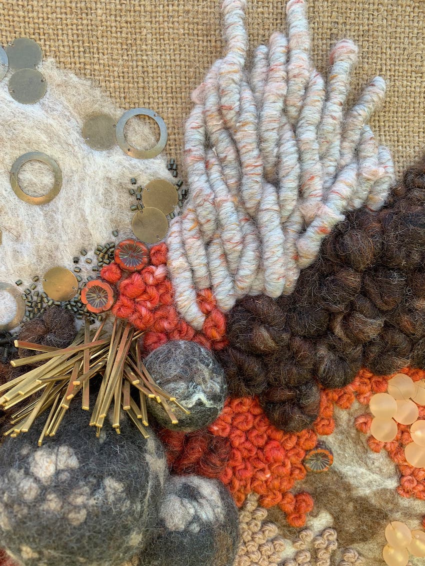 Fils de laine et coton brodés à la main avec perlage et feutrage, sur base de toile de jute