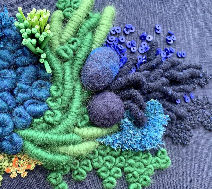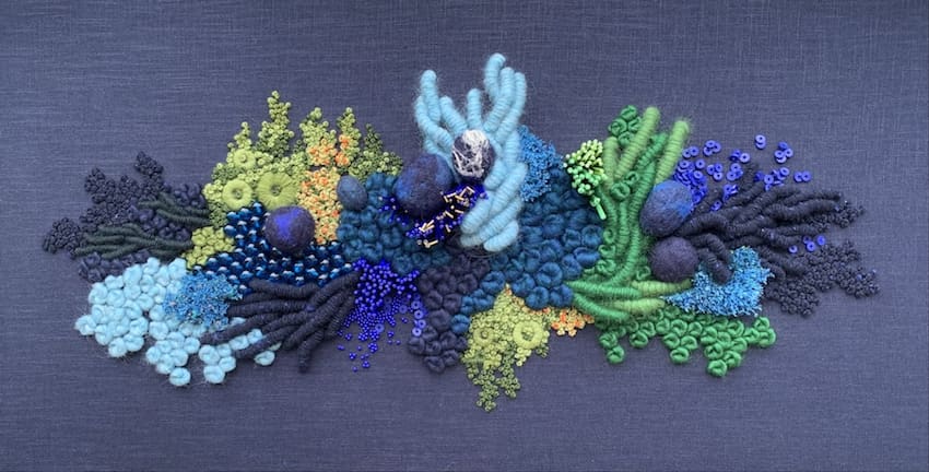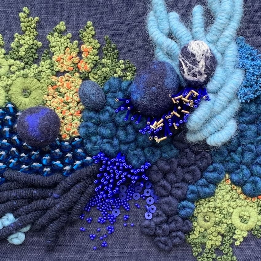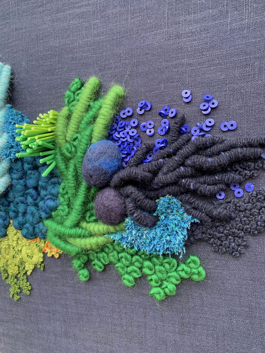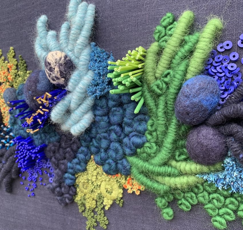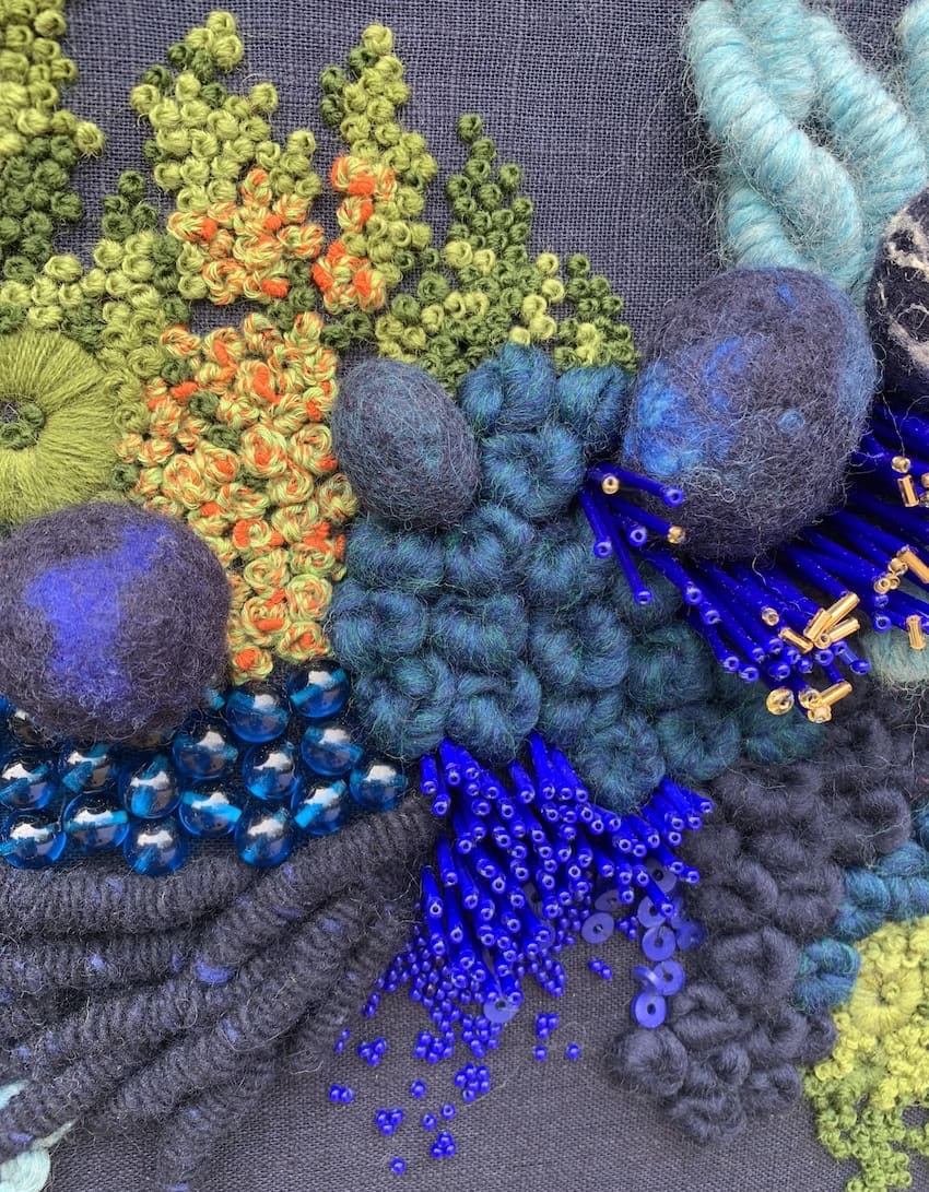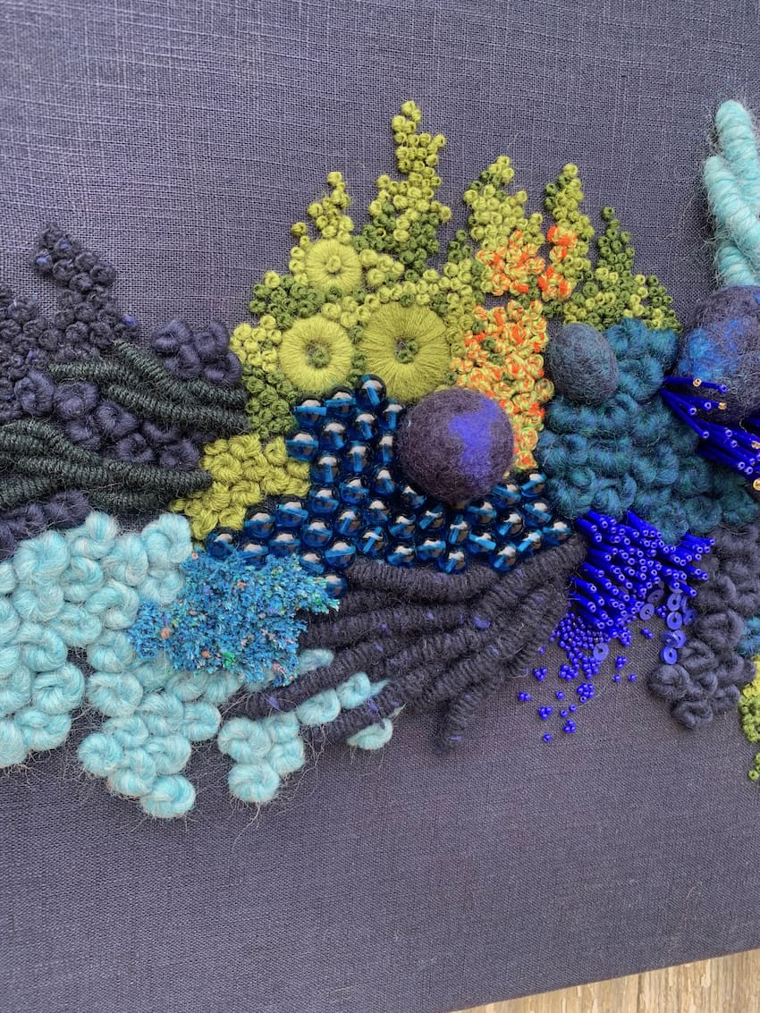 Hand embroidered wool and cotton threads with beading and felting, on cotton base, in a wooden frame
