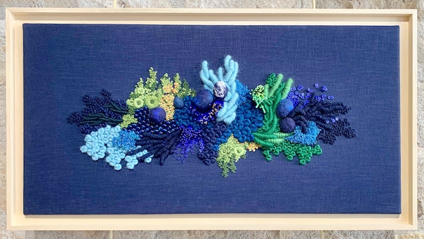 Fils de laine et coton brodés à la main avec perlage et feutrage, sur base de coton, dans un cadre en bois