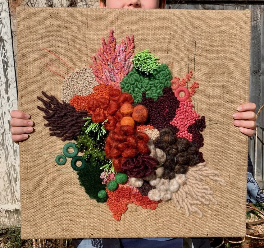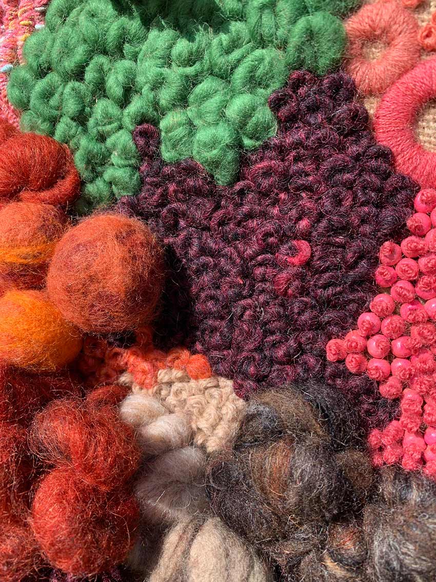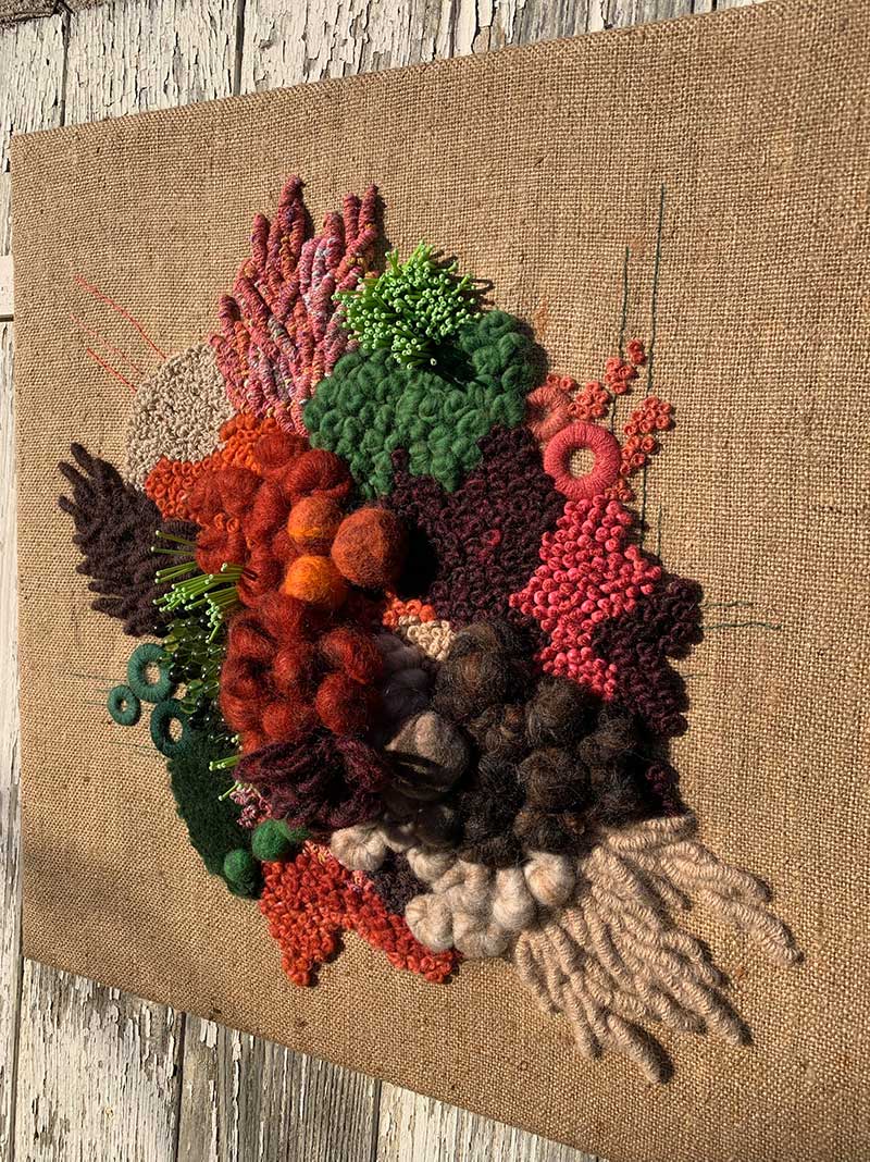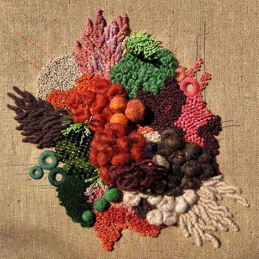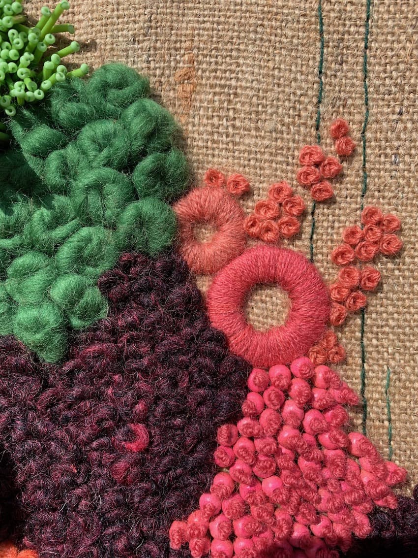 Fils de laine et coton brodés à la main avec perlage et feutrage, sur base de toile de jute